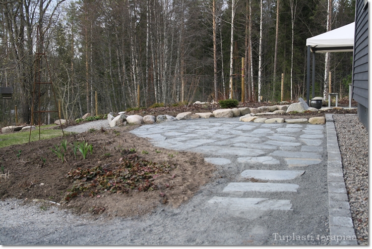 Siihen pientä alkulämmittelyä oli liuskekiveyksen tekeminen takapihalle ja paviljongin alle.